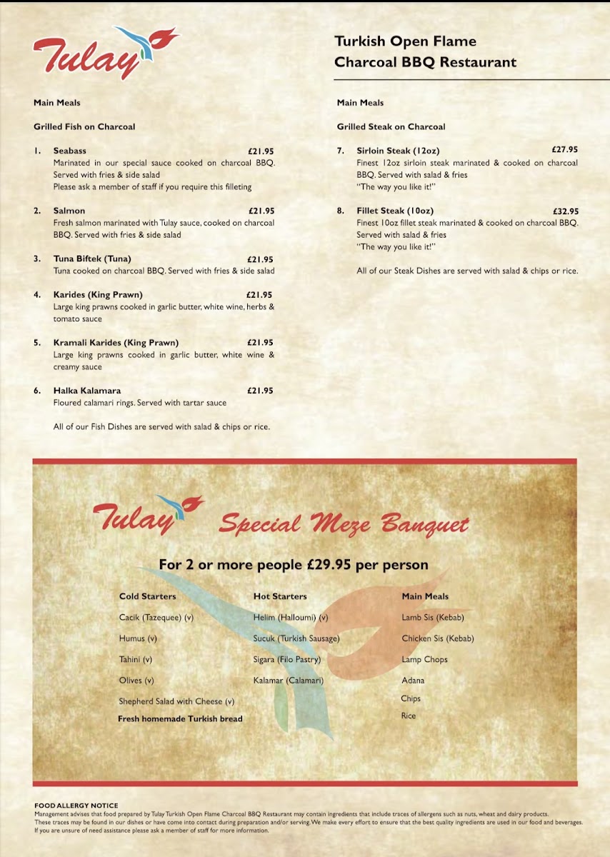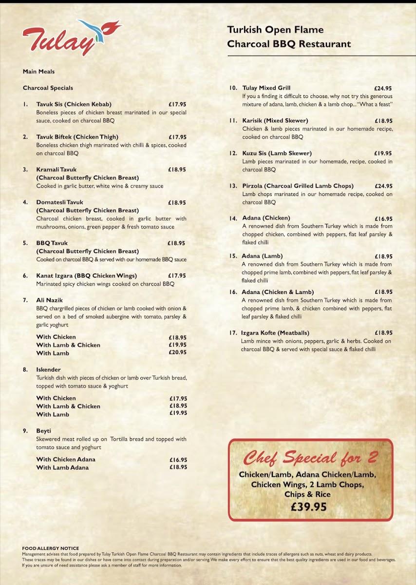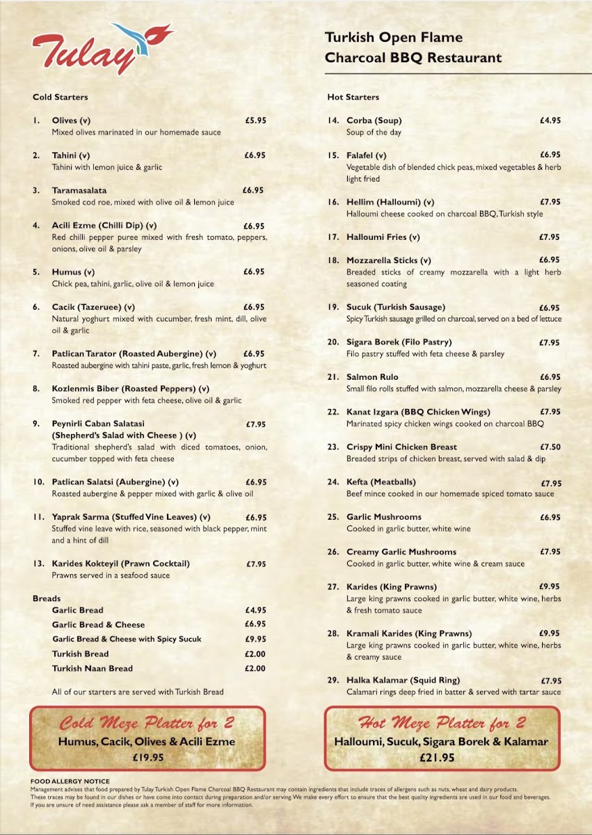 From a reviewer’s perspective, the menu at Tulay Turkish BBQ Restaurant & Bar offers a well-rounded and satisfying selection that highlights both traditional Turkish flavors and crowd-pleasing favorites. The sharing options like the Cold Meze Platter For 2 and Hot Meze Platter For 2, along with the indulgent Chef Special For 2 and Special Meze Banquet, make it ideal for groups looking to sample a variety of dishes. Starters such as Humus (V), Taramasalata, and Acili Ezme (V) provide a fresh and authentic beginning, while warm bites like Falafel (V), Halloumi Fries (V), and Mozzarella Sticks (V) add comforting variety. The charcoal grill section stands out with dishes like Tavuk Sis, Tavuk Biftek, and BBQ Tavuk, delivering smoky, well-seasoned meats, while house specialties such as Firinda Kuzu, Kuzu Guvec, and Karniyarik showcase rich, slow-cooked flavors. Vegetarians are well catered for with options like Sebze Guvec (V) and Musakka (V). Seafood lovers can enjoy Seabass, Salmon, or Karides, and steak enthusiasts have solid choices in Sirloin Steak and Fillet Steak. Complemented by sides like Cacik (V) and freshly baked Garlic Bread & Cheese, the menu feels complete and thoughtfully curated, even extending to a simple Kids Menu for families.