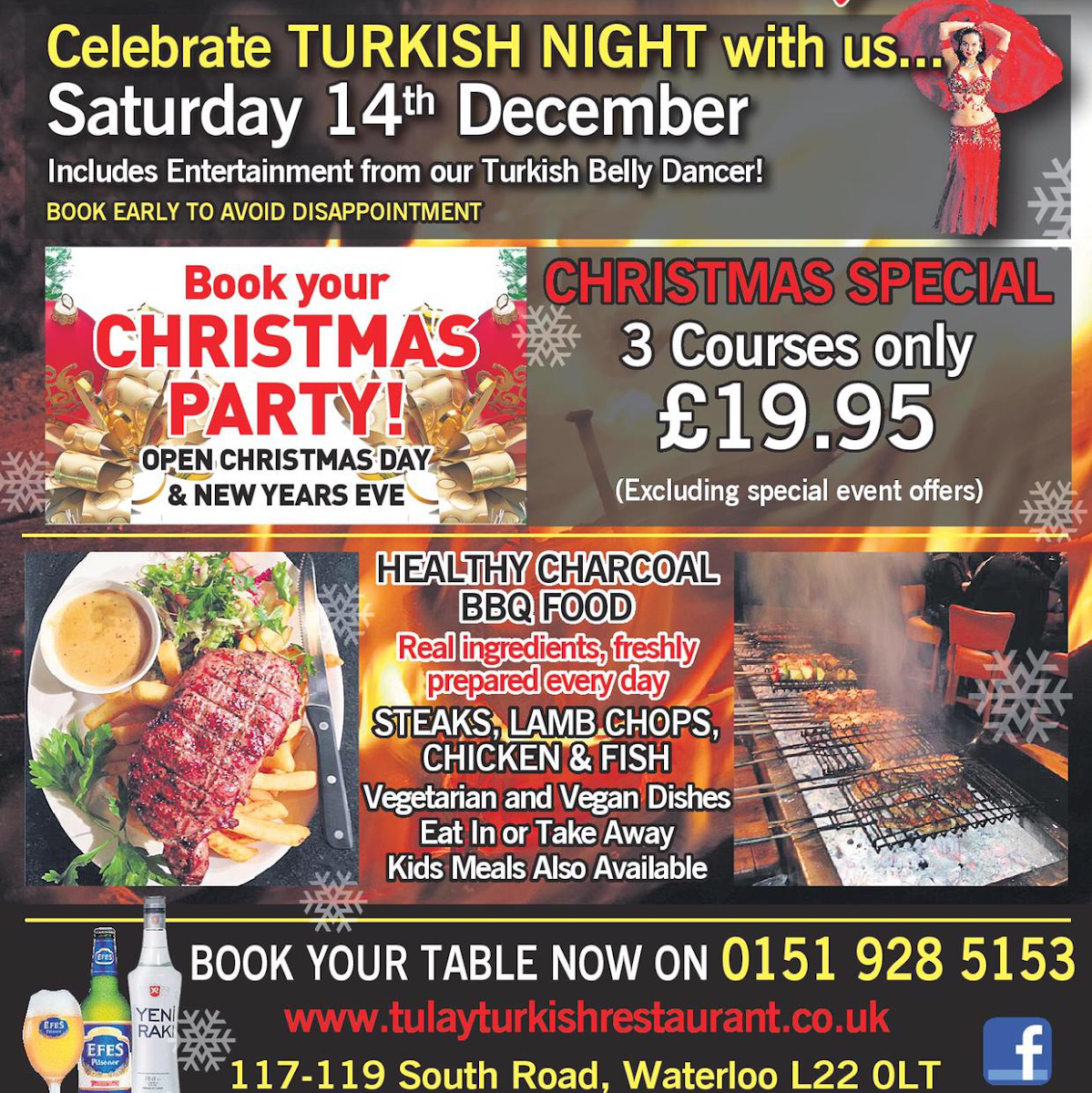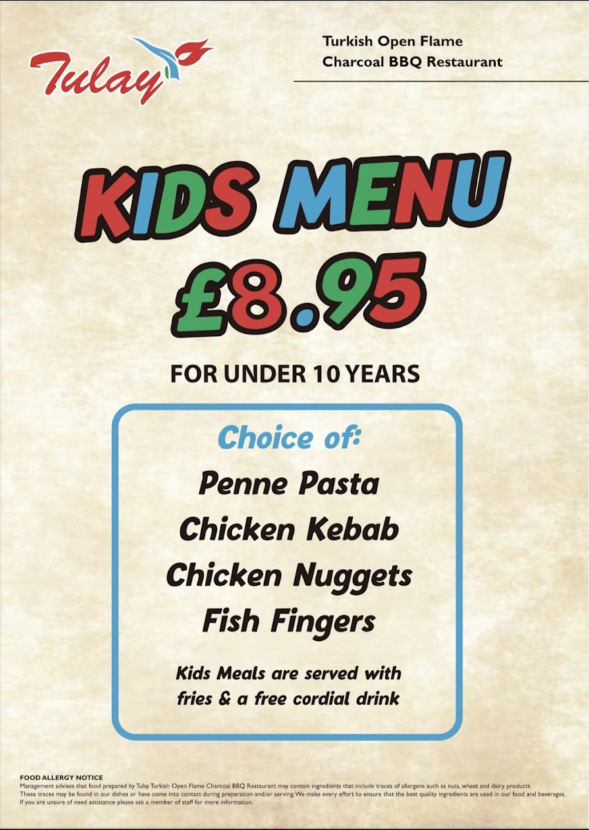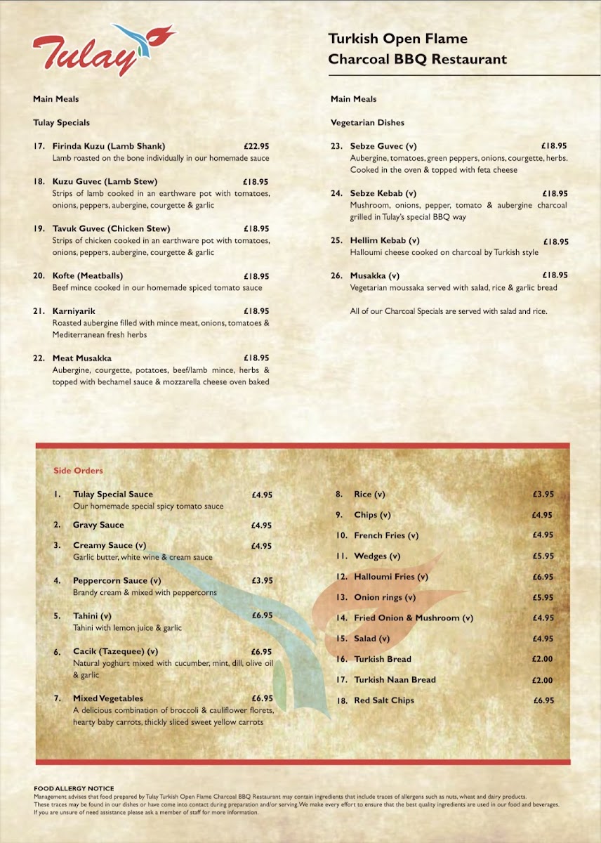 From a reviewer’s perspective, the menu at Tulay Turkish BBQ Restaurant & Bar offers a well-rounded and satisfying selection that highlights both traditional Turkish flavors and crowd-pleasing favorites. The sharing options like the Cold Meze Platter For 2 and Hot Meze Platter For 2, along with the indulgent Chef Special For 2 and Special Meze Banquet, make it ideal for groups looking to sample a variety of dishes. Starters such as Humus (V), Taramasalata, and Acili Ezme (V) provide a fresh and authentic beginning, while warm bites like Falafel (V), Halloumi Fries (V), and Mozzarella Sticks (V) add comforting variety. The charcoal grill section stands out with dishes like Tavuk Sis, Tavuk Biftek, and BBQ Tavuk, delivering smoky, well-seasoned meats, while house specialties such as Firinda Kuzu, Kuzu Guvec, and Karniyarik showcase rich, slow-cooked flavors. Vegetarians are well catered for with options like Sebze Guvec (V) and Musakka (V). Seafood lovers can enjoy Seabass, Salmon, or Karides, and steak enthusiasts have solid choices in Sirloin Steak and Fillet Steak. Complemented by sides like Cacik (V) and freshly baked Garlic Bread & Cheese, the menu feels complete and thoughtfully curated, even extending to a simple Kids Menu for families.